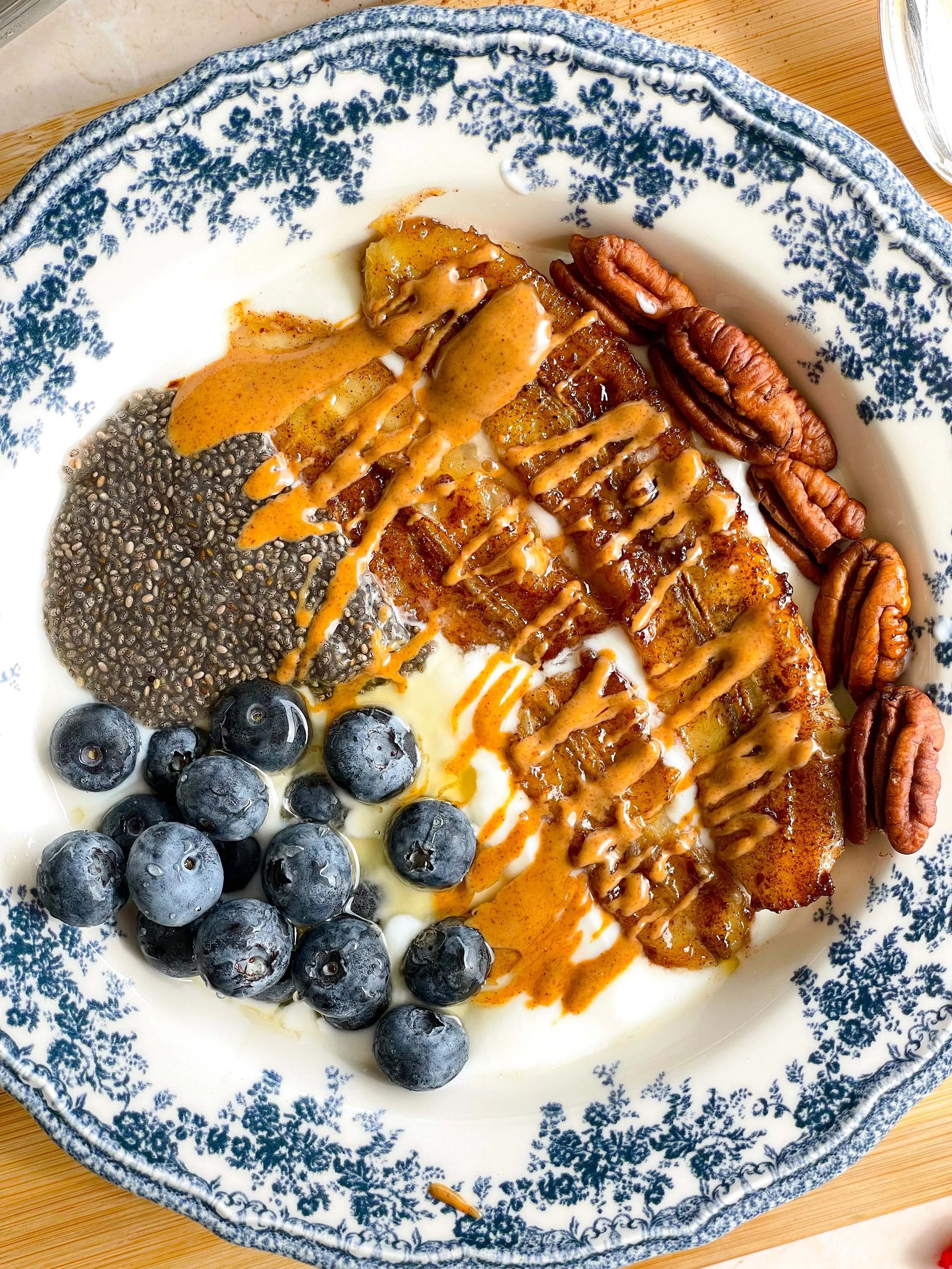 “Caramelized banana yogurt bowl” sounds more like a dessert recipe, and if you ask me those are the best kinds of breakfast recipes. Even better when said recipe is actually healthy AND delicious, both of which this is (yay!!!) This yogurt bowl is refined sugar-free, full of protein from the greek yogurt, and healthy fats from the nuts. And for my fiber-obsessed queens out there, the addition of chia seed pudding, which is great for overall gut health.
