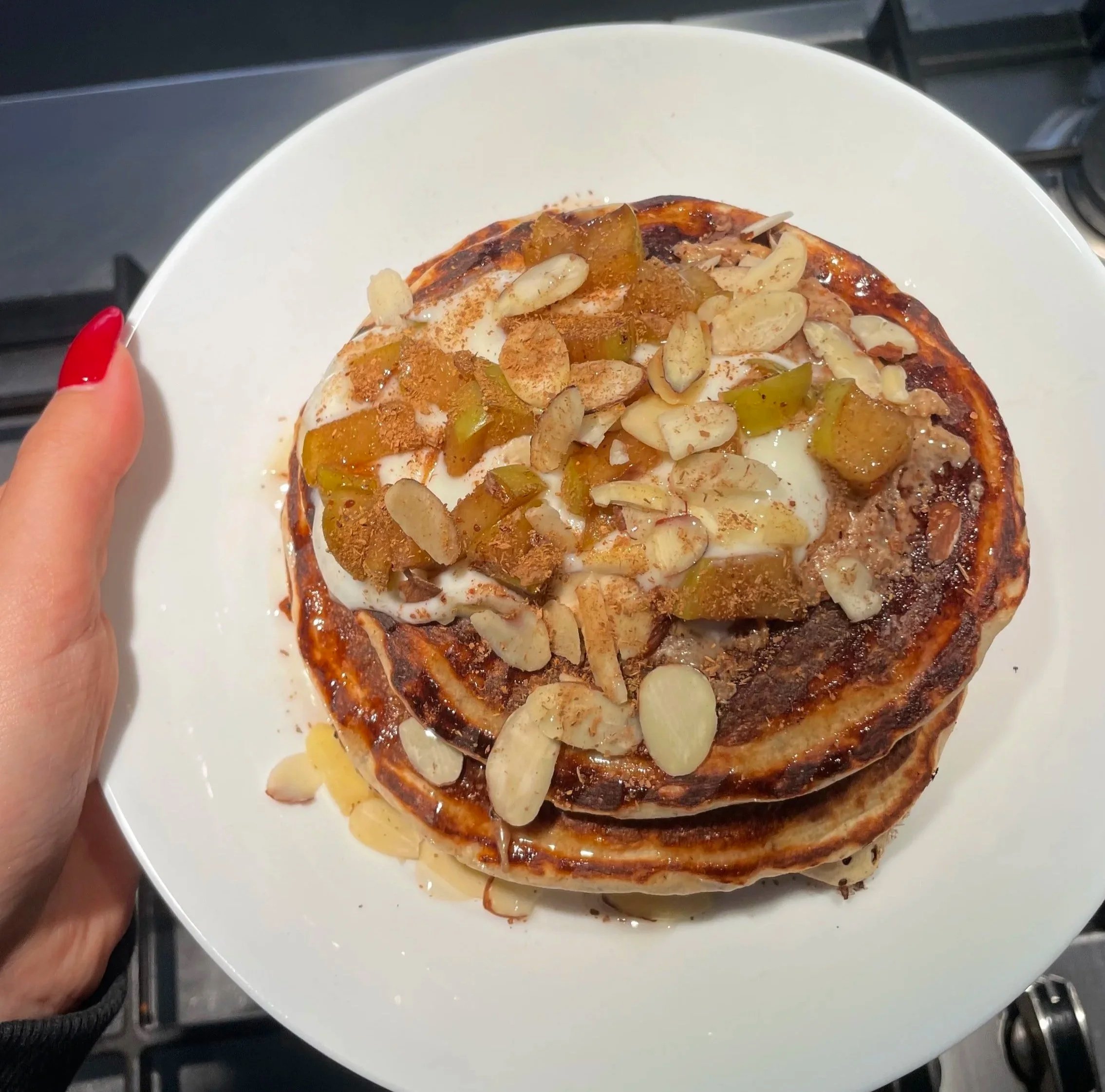 Fluffy banana pancake stack, apples cooked in sugar-free maple syrup, cinnamon & vanilla, sliced almonds for some crunch, & a final pinch of cinnamon & syrup on top.