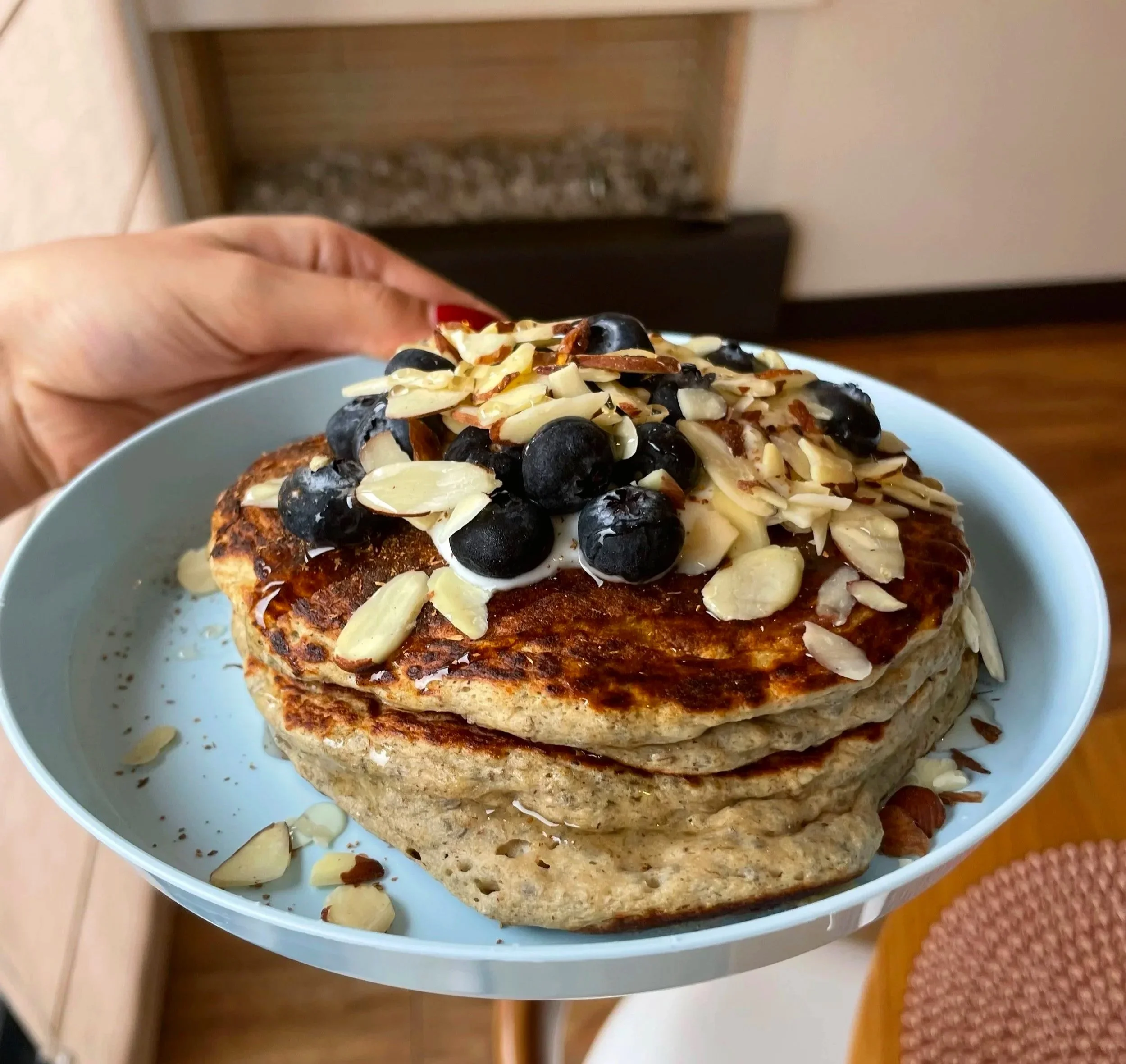 Fluffy banana pancake stack, with juicy blueberries cooked inside the batter, topped with more fresh blueberries, a maple greek yogurt sauce, crunchy almond slices, & a dash of cinnamon.